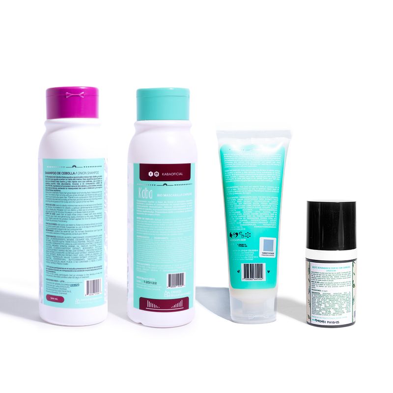 Contiene Shampoo de Cebolla, Bio Mascarilla Capilar, Tratamiento Capilar Repolarizador y Aceite Reparador de Puntas.